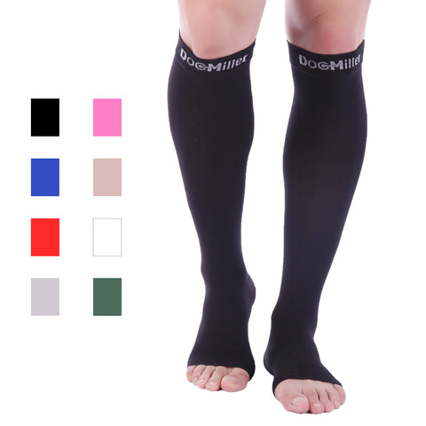 Doc Miller’s Open Toe Compression Socks are designed to be breathable, durable, and comfortable. Constructed with premium fabric containing medical-grade Nylon (77%) and Spandex (23%) for a snug fit that is also comfortable. The lightweight fabric combined with an open toe design allows it to be worn as a stocking with dress clothes as well as during a workout. The gradient pressure allows for healing from injury and post-surgery recovery. The Open Toe Compression Socks boosts blood circulation in your legs and feet.