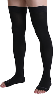 Moderate 15-20 mmHg Support, Unisex Surgical Thigh Highs, Standard Length, Reinforced Heel, Open Toe, Silicone dot on the top band.